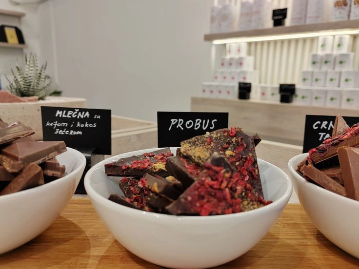 Otkrijte jedinstvene ukuse uparivanja čokolada i vina, ekskluzivne kombinacije sa kozjim sirom i zdrave poput raw i veganskih čokolada. Uživajte u našem širokom asortimanu čokoladnih napitaka, magiji čokoladnih kuglica i elegantnim poklon paketima savršenim za svaku priliku.