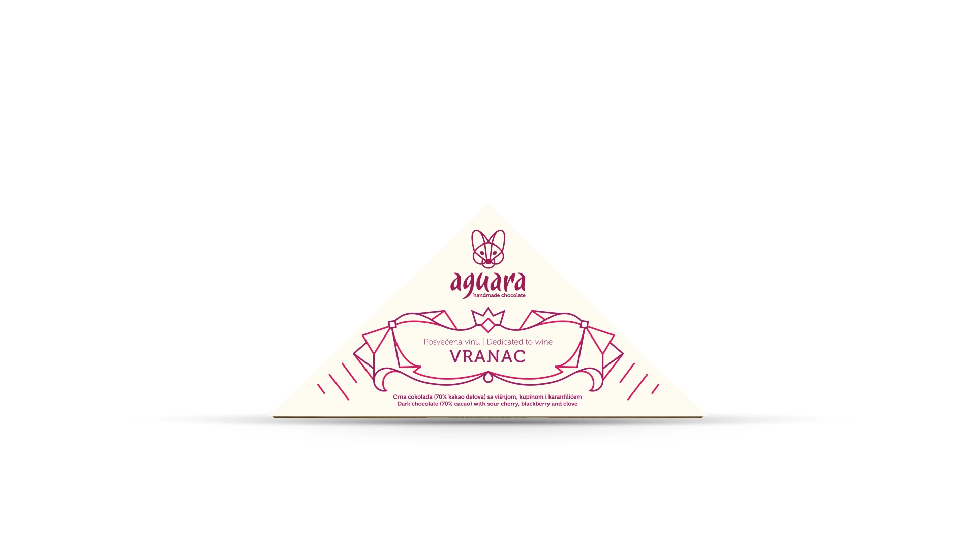 Ja sam crna Aguara, posebna, svojeglava Aguara, posvećena drevnoj vinskoj sorti koja je moćna poput konja u noćnom trku, tamno, pretamno crvena, puna karaktera sa Balkana. Zato je 70% mog bića sačinjeno od crne čokolade, a ostatak, nemiran i spontan, ispunjen višnjom i kupinom i začinjen karanfilićem koji blago, na samom kraju, miluje nepce ukusom mesečine.